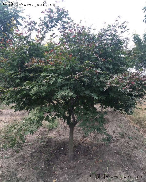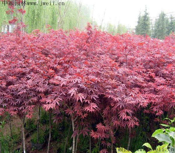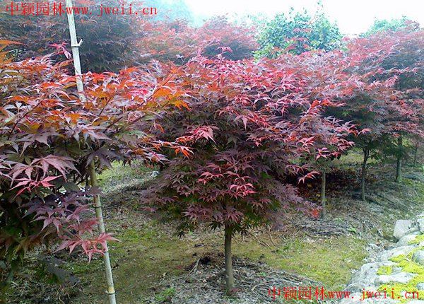 红枫是著名的彩色苗木之一,属于落叶小乔木,树高2~5米,树枝光滑,紫红色。红枫叶鸡爪状,长度5~10cm。红枫是鸡爪槭的变种,细分品种很多,树冠分散平展,丰满茂盛,树叶形状优美,颜色鲜艳持久,层次分明,四季紫红色,观赏价值非常高。在绿化中广泛用于庭院观赏树,以孤植、散植为主,与山石搭配,观赏效果佳。达到设计中的绿化效果,至少要两年的时间才能逐渐体现,但是美丽的枫树,值得人们慢慢呵护,